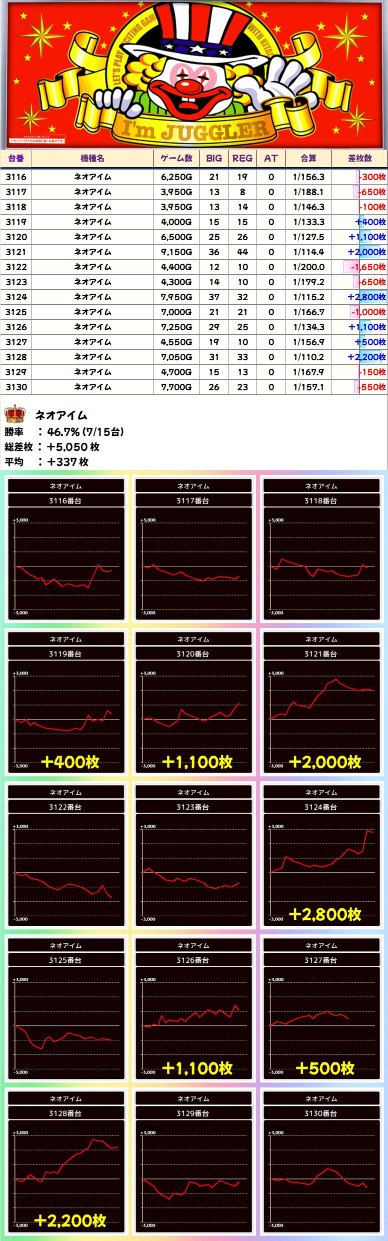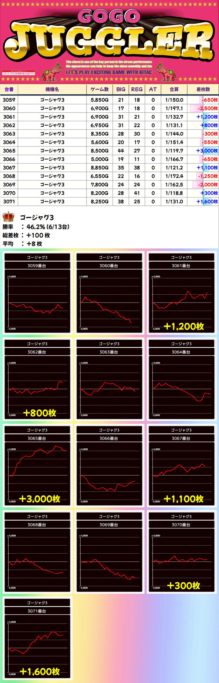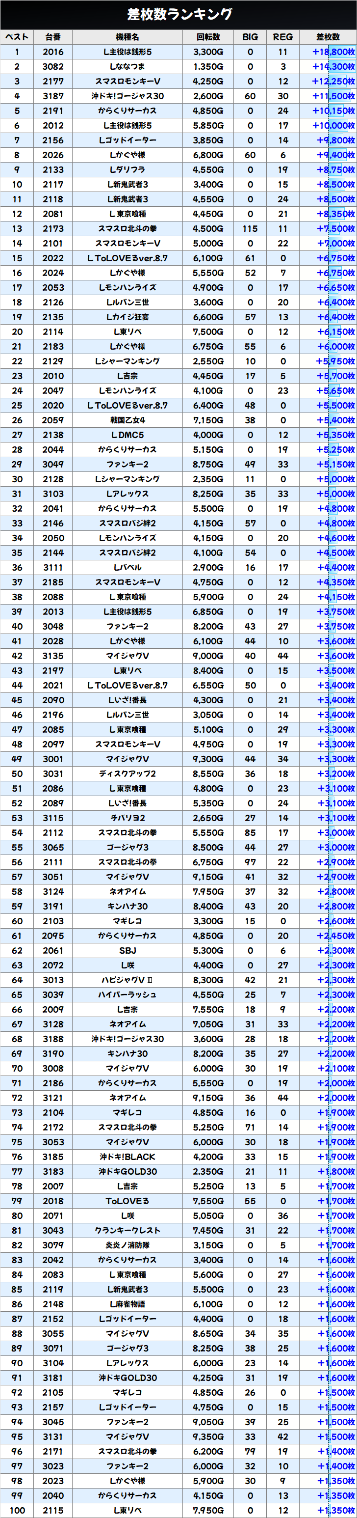 本日の全台系濃厚機種は上記の5機種!末尾だけでなく上質な全台系も用意されており、土曜日の強さが感じ取れます!いずれも勝率・差枚ともに優秀な結果に!