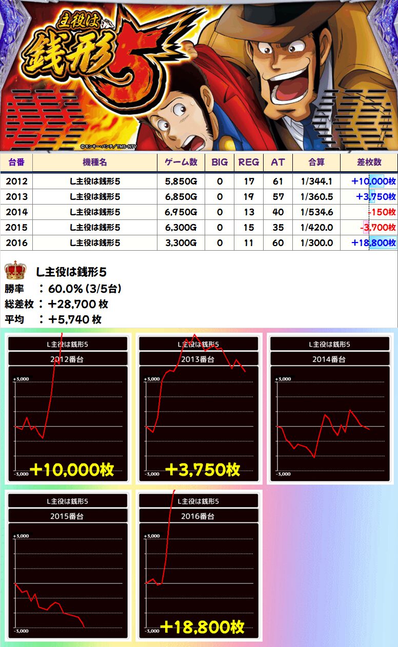 L主役は銭形5 (3/5台+) ➡平均 +5,740枚