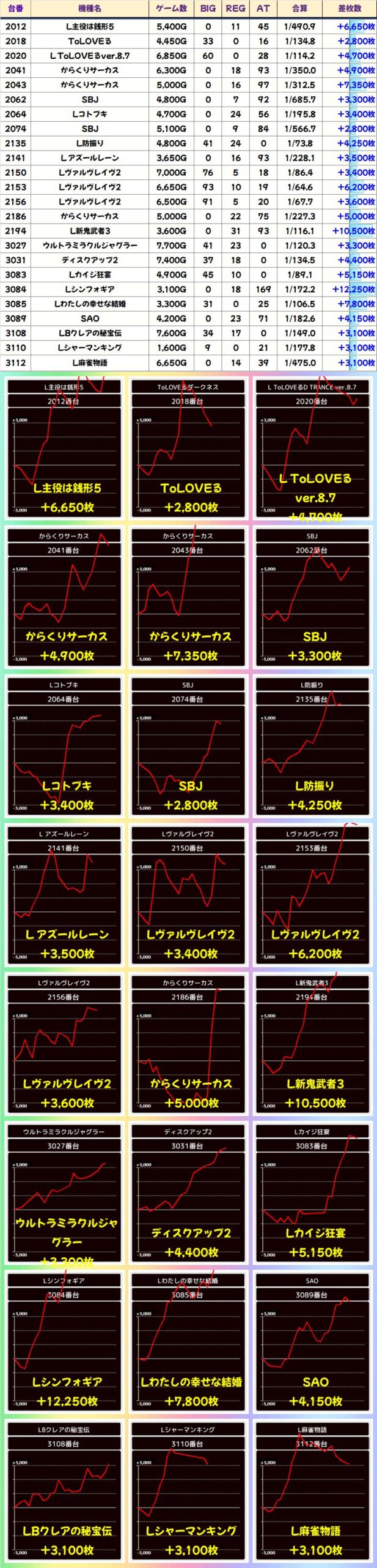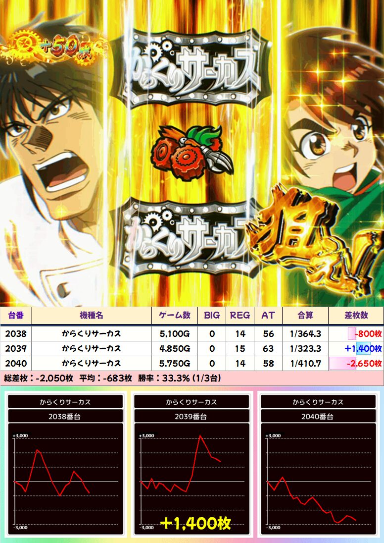 本日の全台系と思われる機種は上記の通り。不発の台もあれどしっかり稼働がついており、結果を残しています。また、全台マイナスですがフル稼働のことを考えるとヴァルヴレイヴにもなにかしら仕掛けが入っていた可能性アリ!