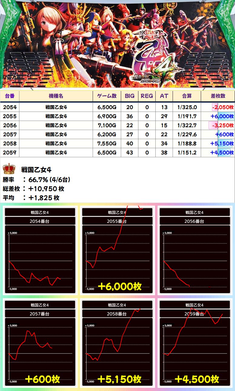 戦国乙女4 (4/6台+) ➡平均 +1,825枚