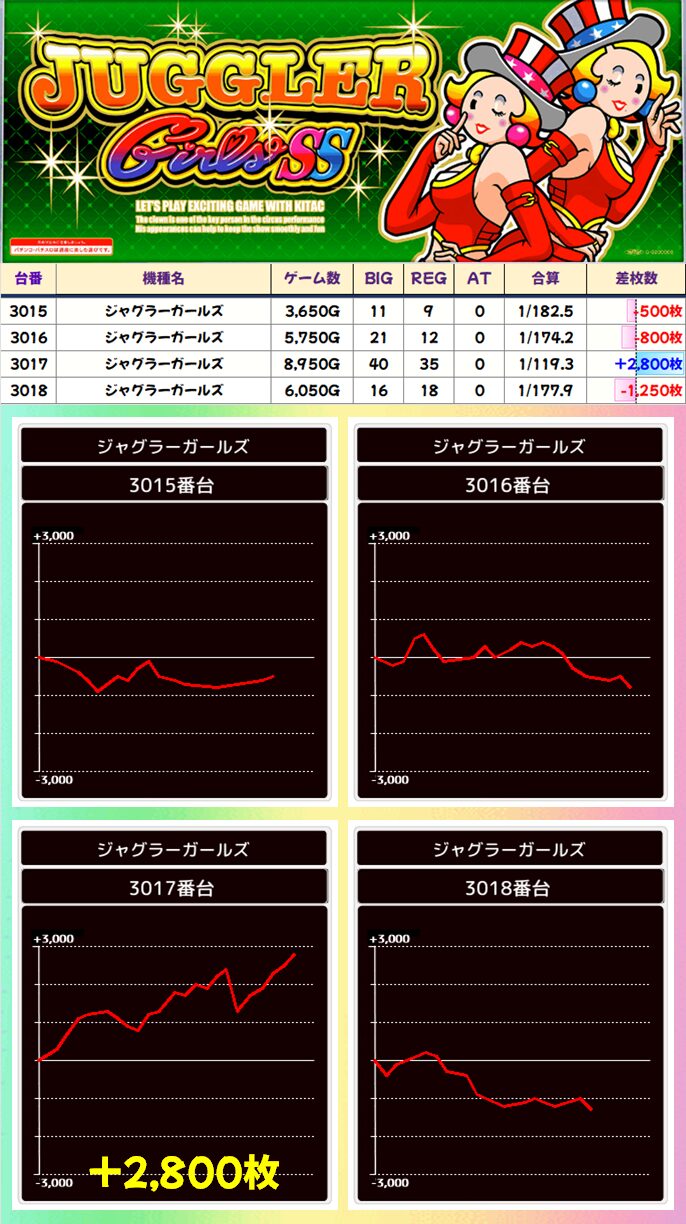 ジャグラーガールズ (1/4台+) ➡平均 +63枚