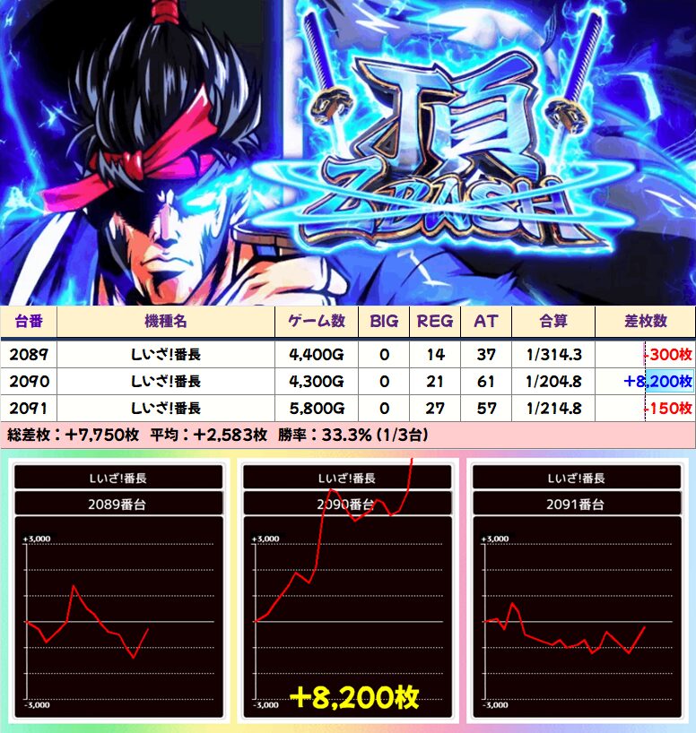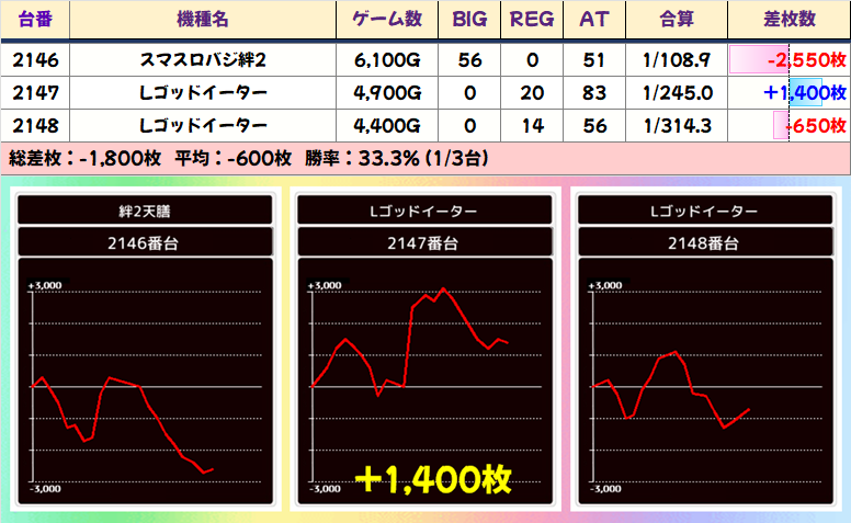 1/2以上の高配分機種も多数アリ!おもに多台数機種から選ばれることになりました。粗目の機種が多いためマイナスの台も目立ちますが、平均差枚はしっかりプラスな結果に!