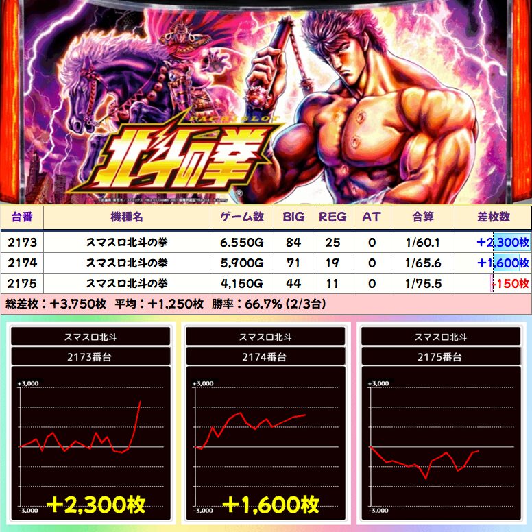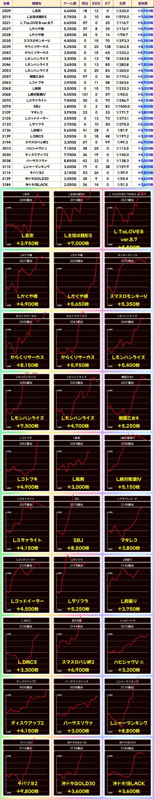 全台系濃厚と思わしき機種は5機種あり、いずれも優秀成績!東リベは11台設置で全台プラスという圧巻の結果!新台のヴヴヴ2もマイナスが1台のみとかなり気合の入った仕掛けとなりました!!土曜日は強めにせめても結果がしっかり帰ってきそうです!