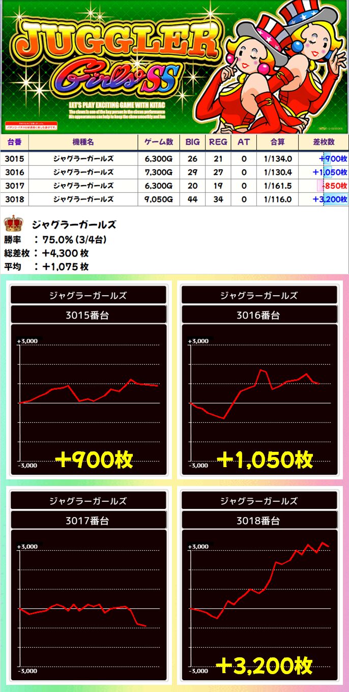 ジャグラーガールズ (3/4台+) ➡平均 +1,075枚