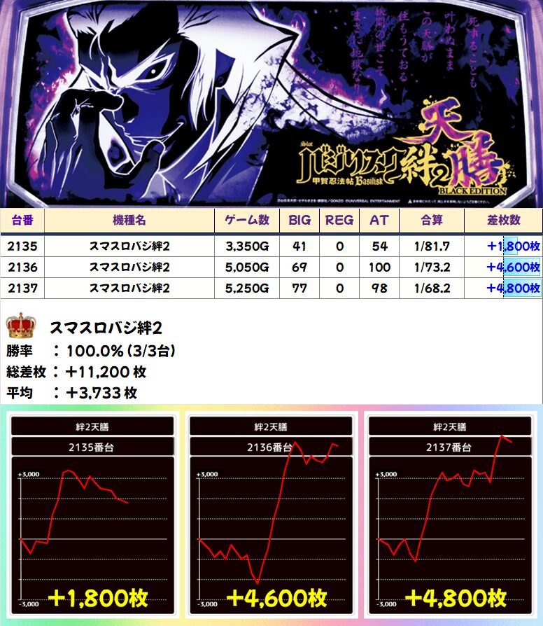 スマスロバジ絆2 (3/3台+) ➡平均 +3,733枚