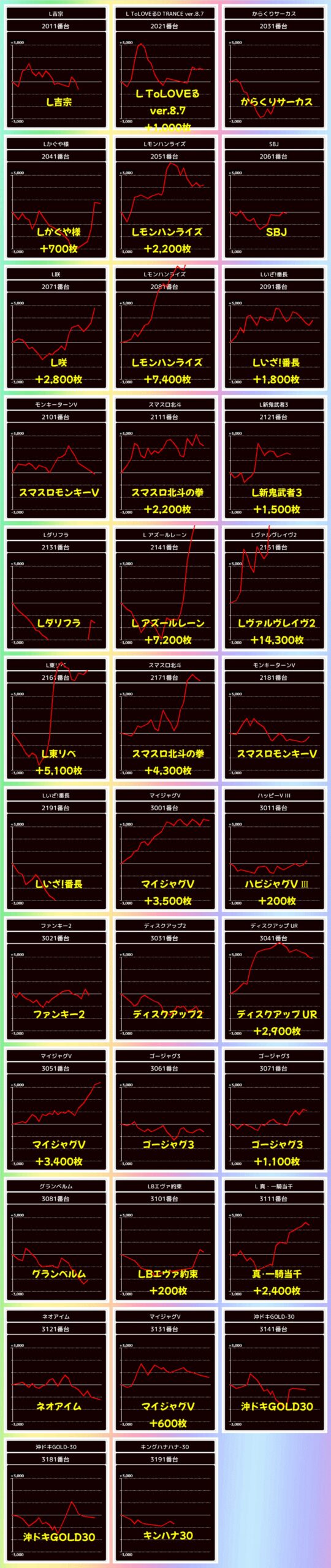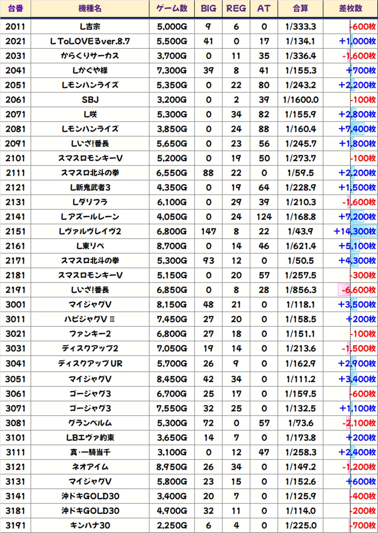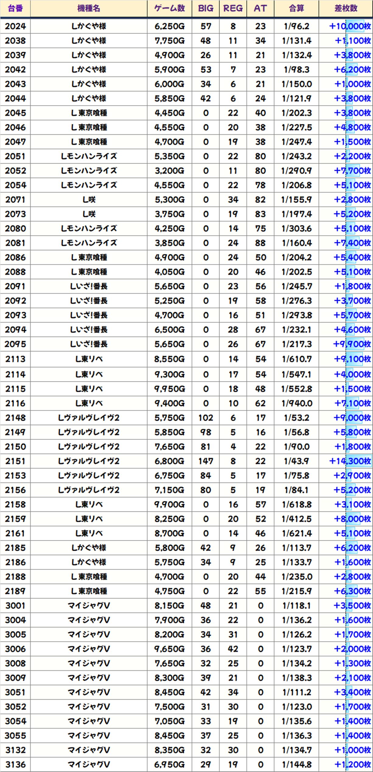 本日の全台系濃厚機種は上記の3機種!末尾だけでなく上質な全台系も用意されており、土曜日の強さが感じ取れます!いずれも勝率・差枚ともに優秀な結果に!