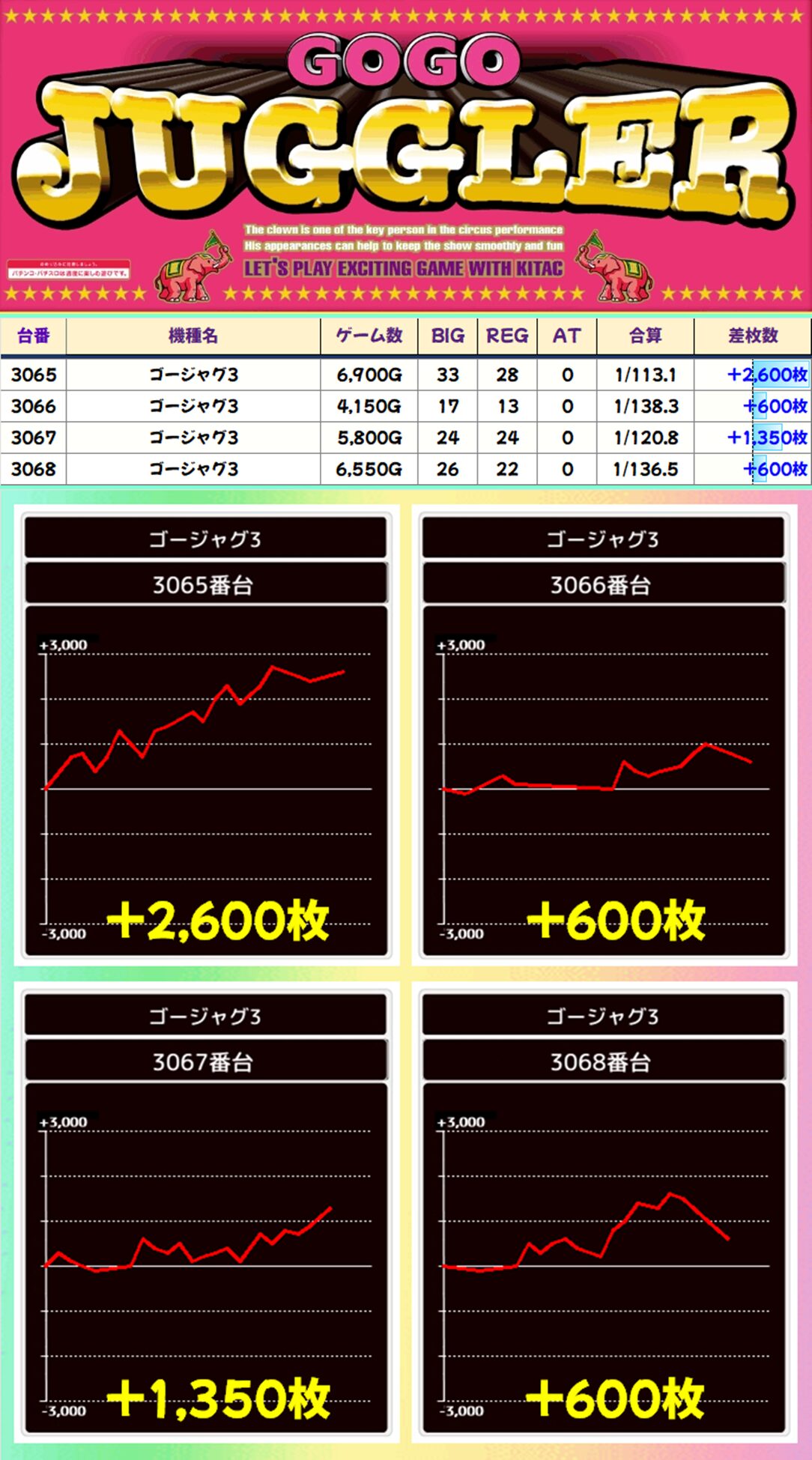 【4台並び】ゴージャグ3(3065-3068番台)平均+1,288枚