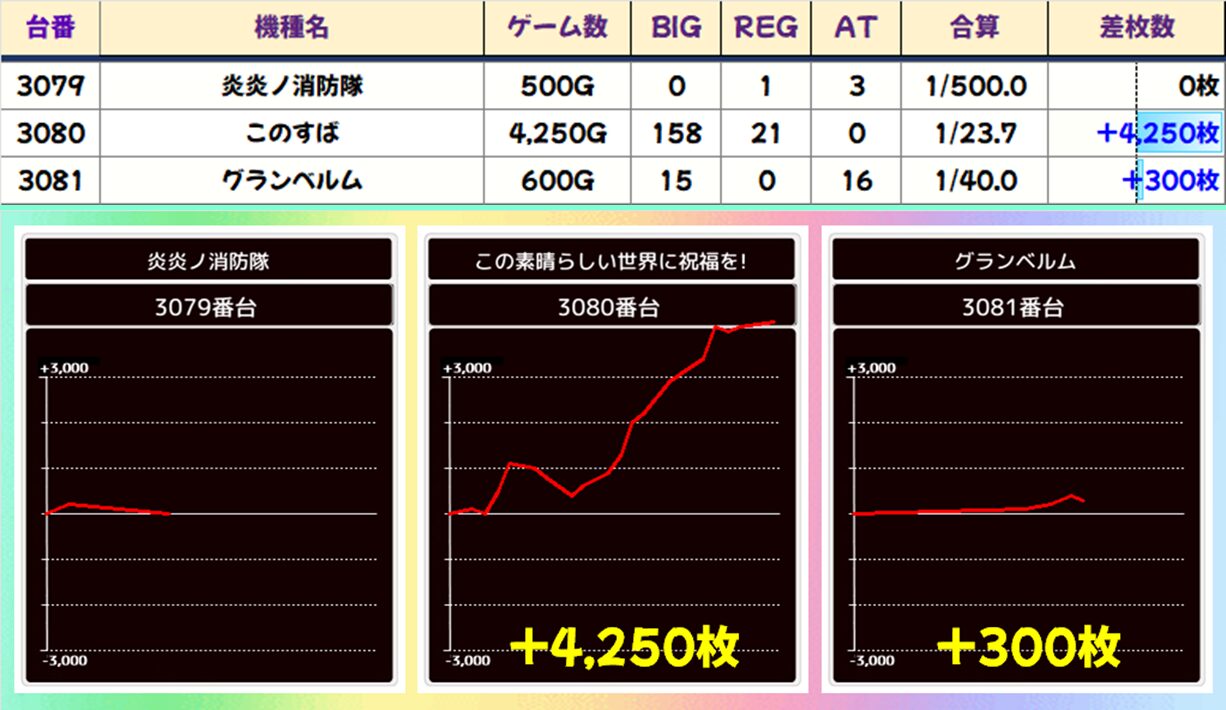 【3台並び】炎炎ノ消防隊&このすば&グランベルム(3079-3081番台)平均+1,517枚