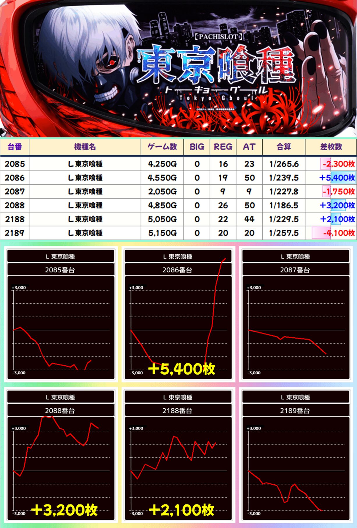 【6台並び】東京喰種(2085-2088,2188-2189番台)平均+425枚