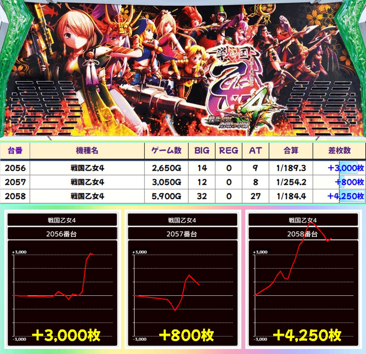 【3台並び】戦国乙女4(2056-2058番台)平均+2,683枚