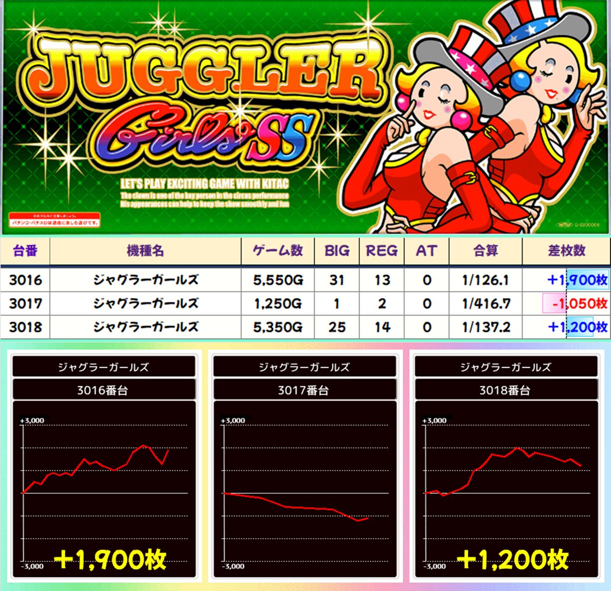 【3台並び】ジャグラーガールズ(3016-3018番台)平均+683枚
