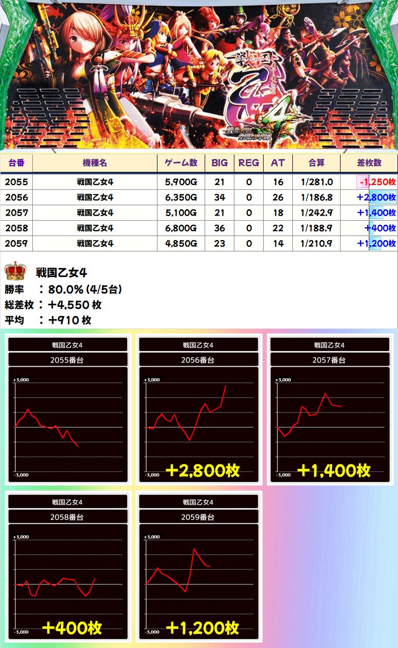 戦国乙女4 (4/5台+) ➡平均 +910枚