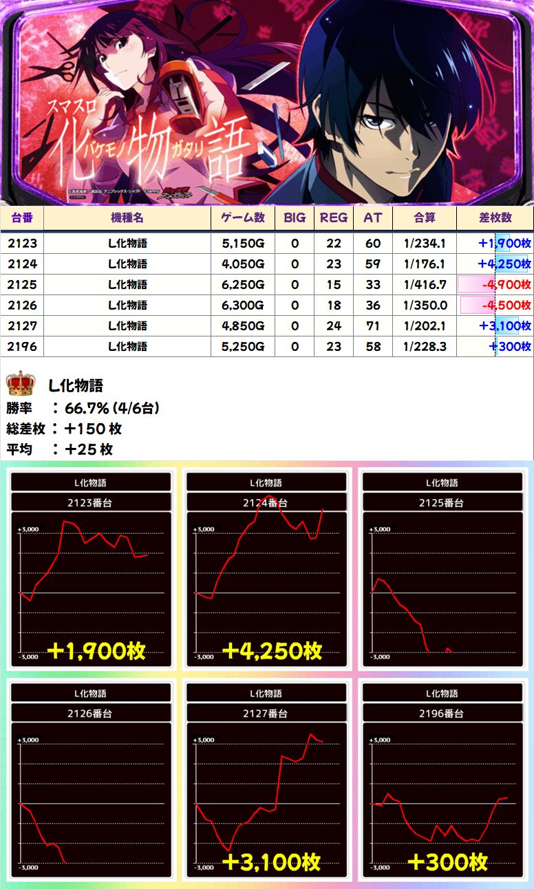 今回は多台数設置のメイン機種を筆頭に高配分仕掛けが用意!さらに新台の化物語も高配分でした。北斗と喰種からは万枚も!