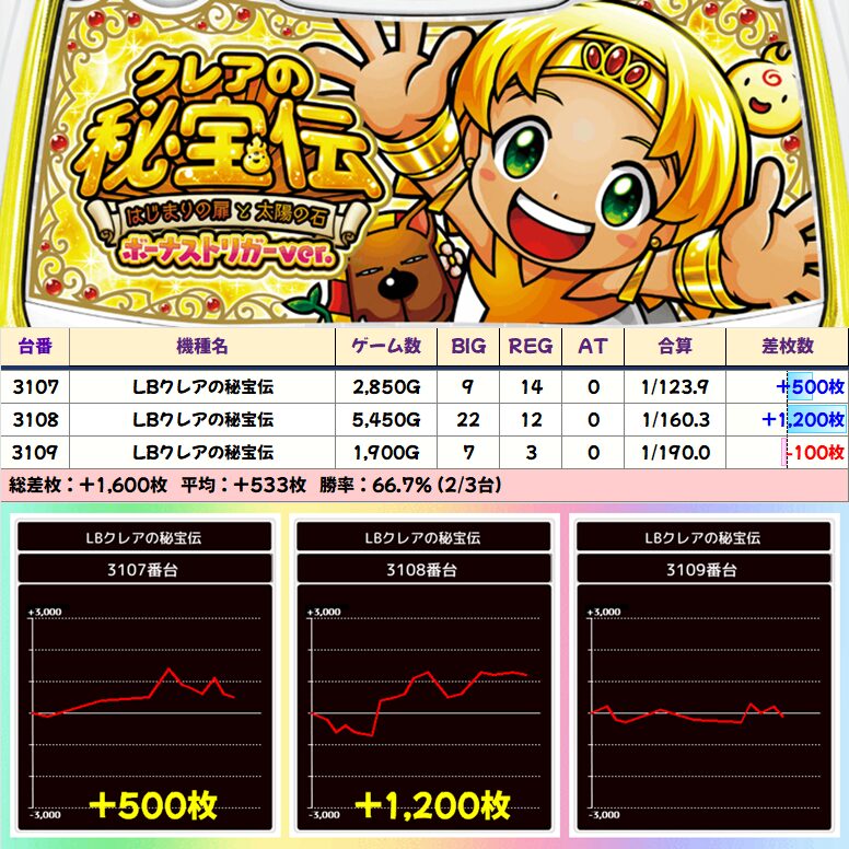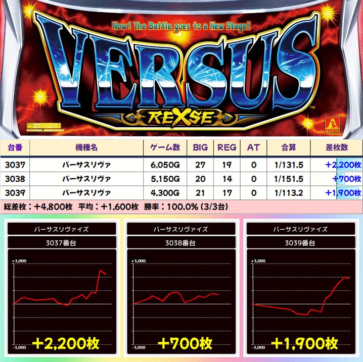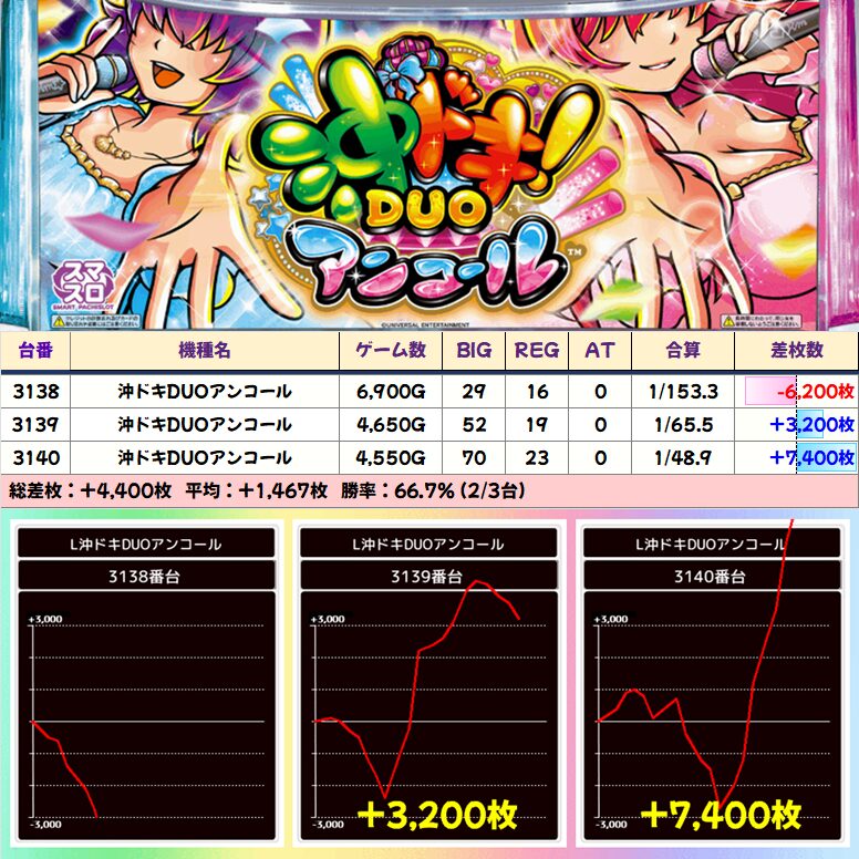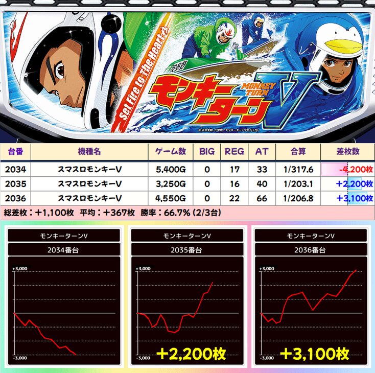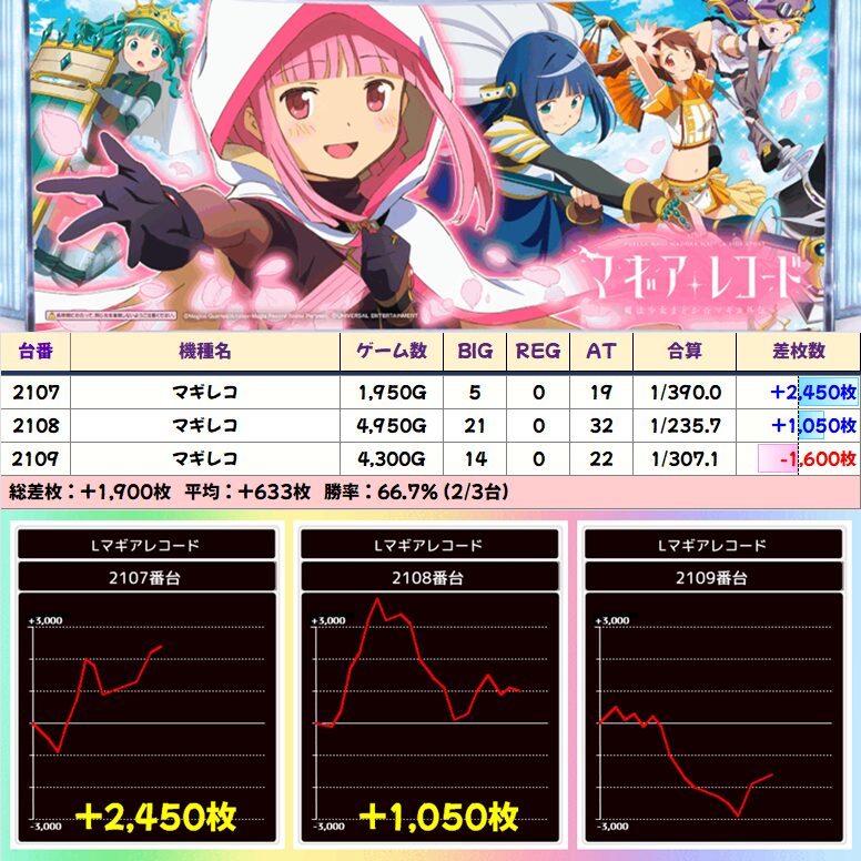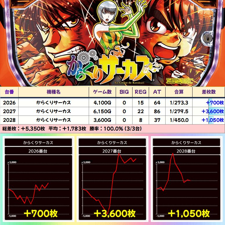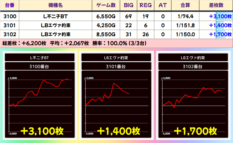 本日の全台系濃厚機種は上記2機種。いずれも勝率が良く平均差枚がしっかりプラスに!