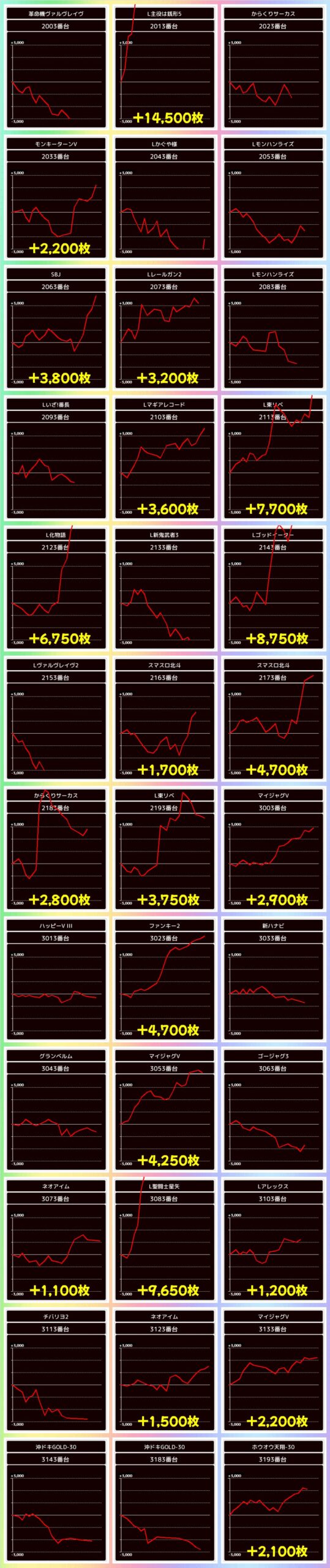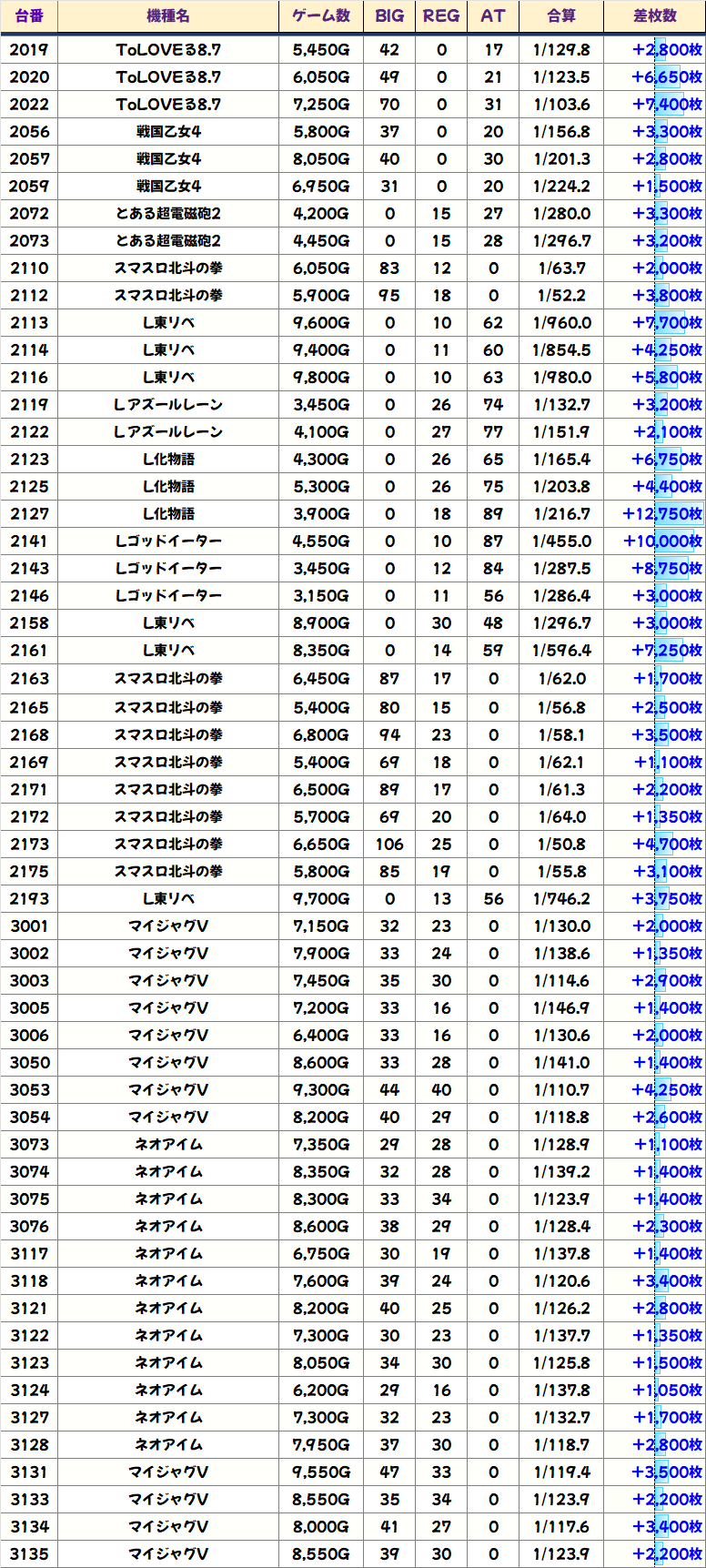 本日の全台系濃厚機種は上記の5機種!末尾だけでなく上質な全台系も用意されており、土曜日の強さが感じ取れます!いずれも勝率・差枚ともに優秀な結果に!今回はBT機が多く全台系に選ばれました。