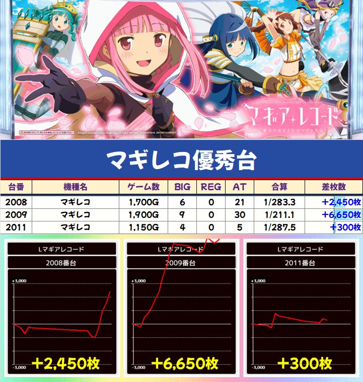 本日の全台系濃厚機種は上記2機種。さらにかぐや様・モンキーターン。マギレコはパネルごとに全台系濃厚機種があり、かぐや様・モンキーターンは初期パネル、マギレコはコネクトパネルが好結果に!