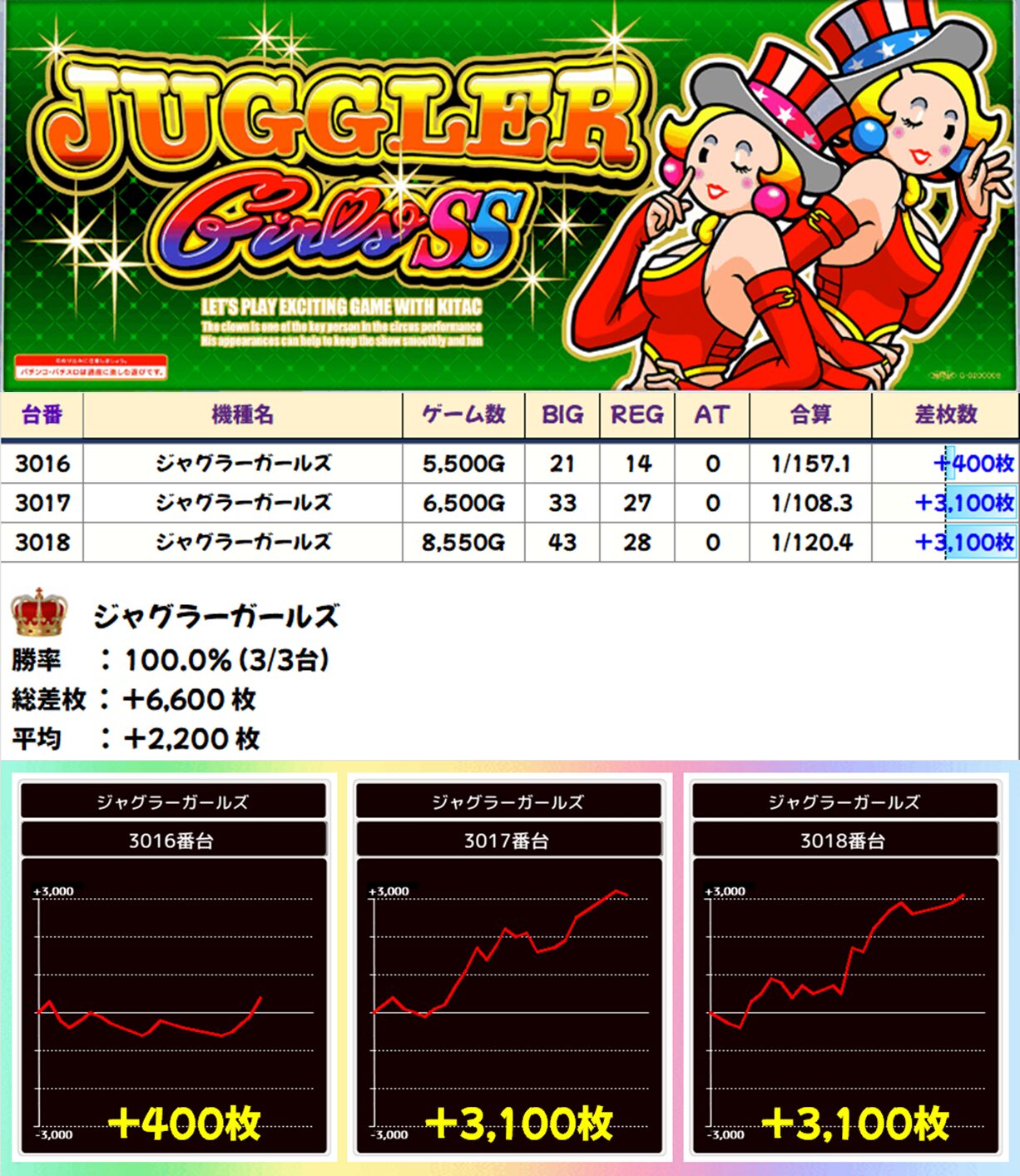 ジャグラーガールズ (3/3台+) ➡平均 +2,200枚