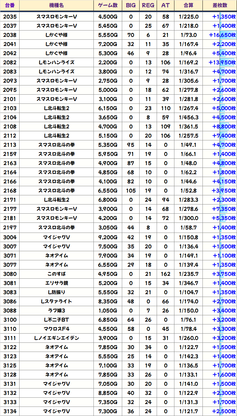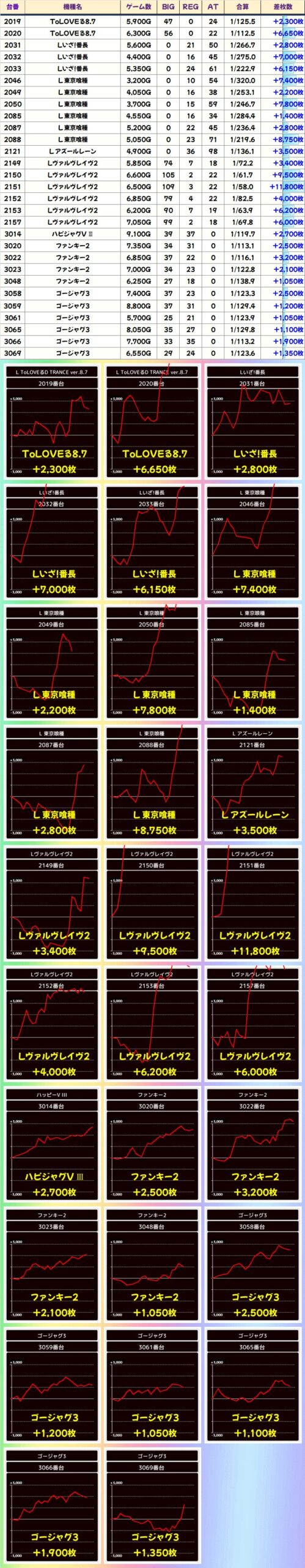 全台系濃厚機種は6機種あり。本日は2台設置機種からの仕掛けが目立つ結果になりました!周年日は3台以上機種を狙いがちですが、2台以下機種もしっかり狙えます!