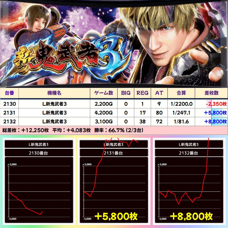 【3台並び】新鬼武者3(2130-2132番台)➡平均+4,083枚