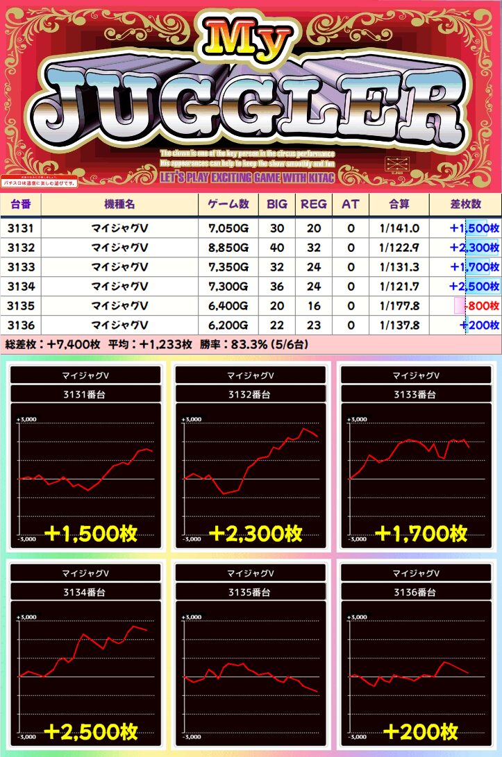 【6台並び】マイジャグラーV(3131-3136番台)➡平均+1,233枚