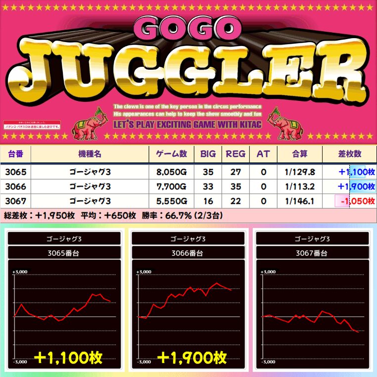 【3台並び】ゴーゴージャグラー3(3065-3067番台)➡平均+650枚