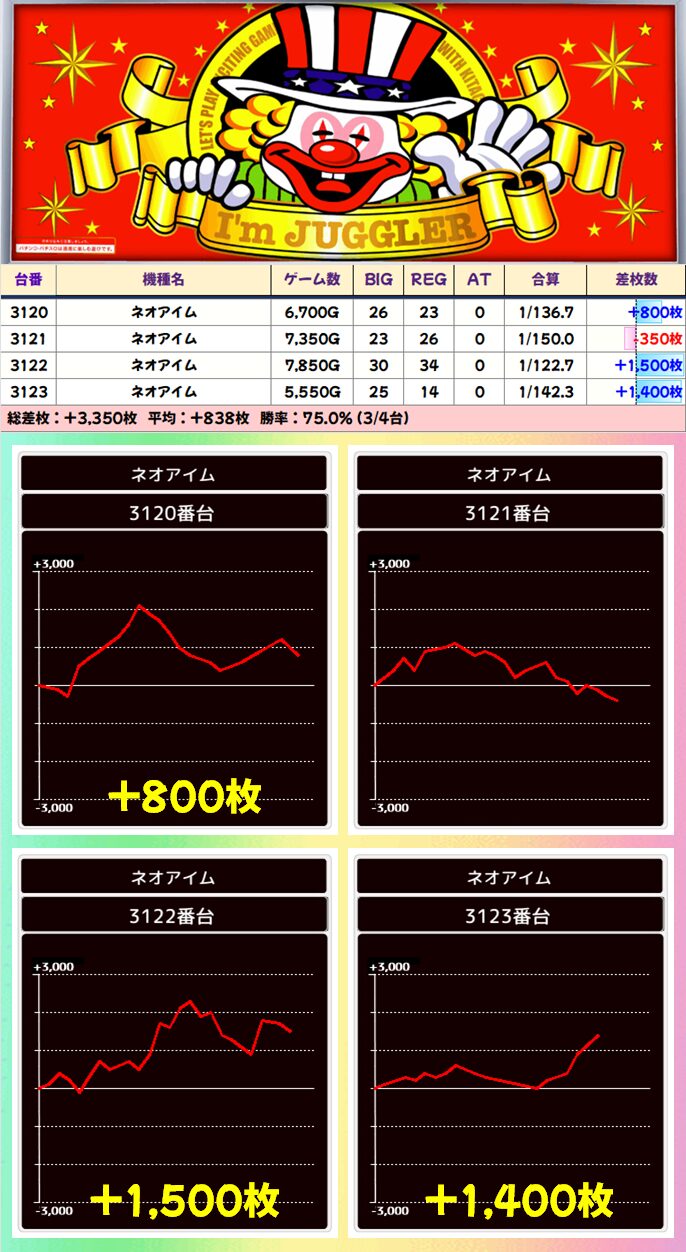 【4台並び】ネオアイムジャグラー(3120-3123番台)➡平均+838枚