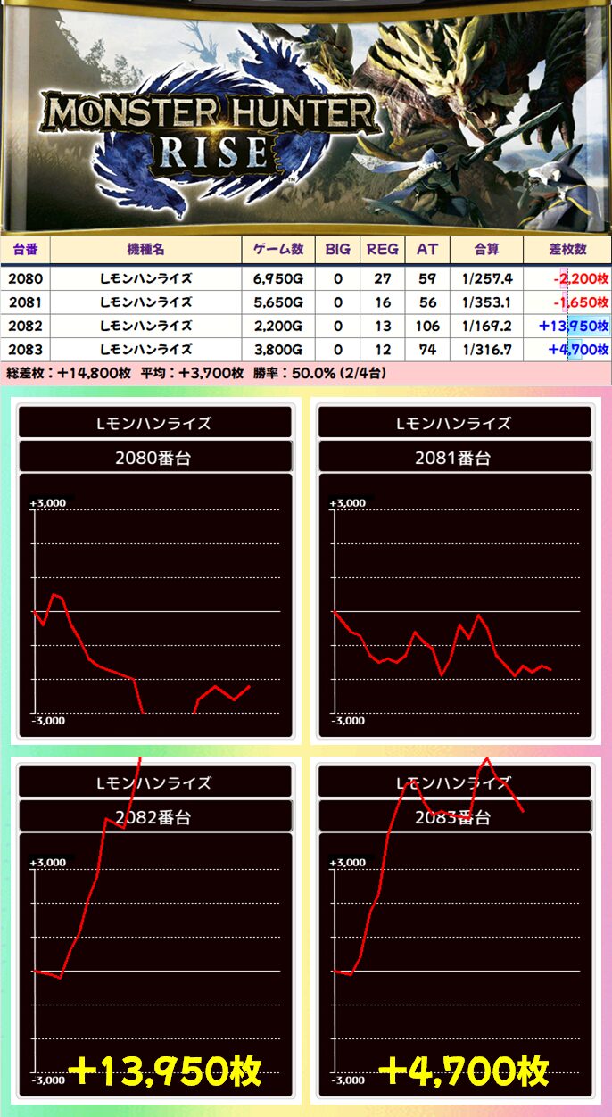 【4台並び】モンスターハンターライズ(2080-2083番台)➡平均+3,700枚