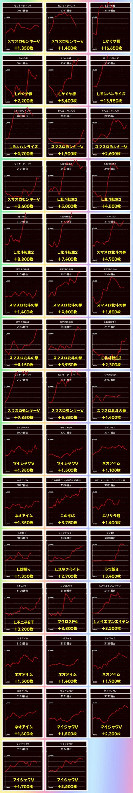 1/2系と思わしき機種も多数アリ!ポスター機種のヴヴヴ2からは万枚もあり優秀台多数!上記機種の1000枚以上獲得台をピックアップしてみました。