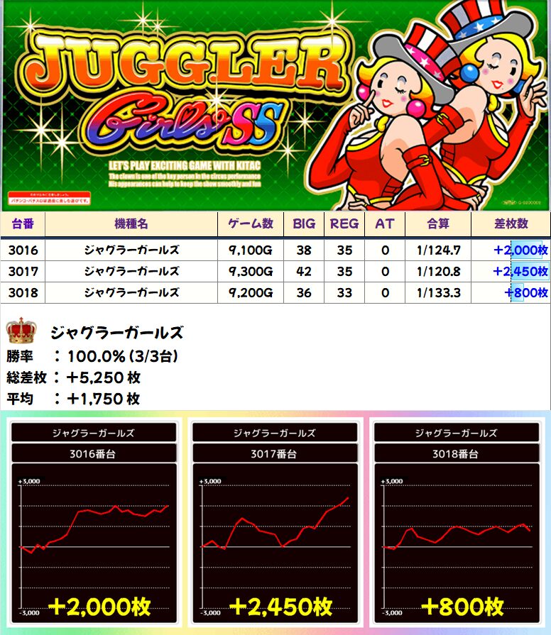 ジャグラーガールズ (3/3台+) ➡平均 +1,750枚