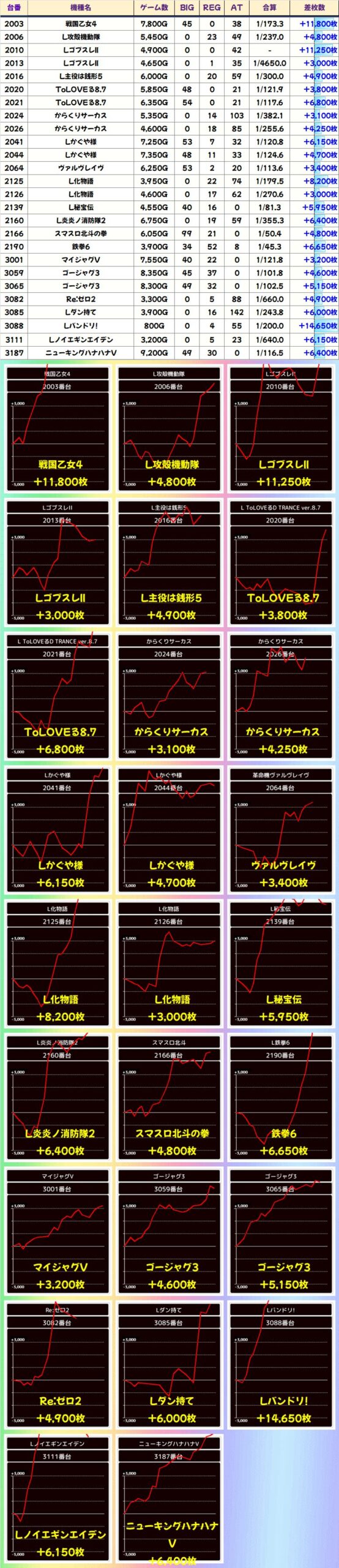 本日の全台系は上記の通り!2Fだけでなく3Fからも全台系が複数アリ!多台数設置機種のモンキーターンやジャグなどさまざまな機種から仕掛けが飛び出しました!吉宗からはコンプ濃厚台も確認!!