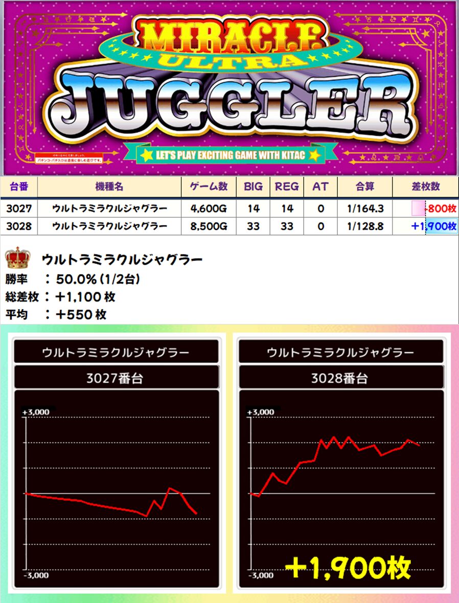 ウルトラミラクルジャグラー (1/2台+) ➡平均 +550枚