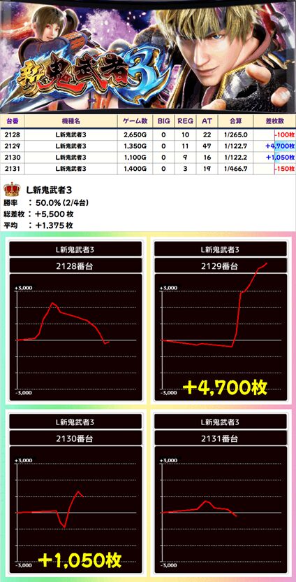 L新鬼武者3 (2/4台+) ➡平均 +1,375枚