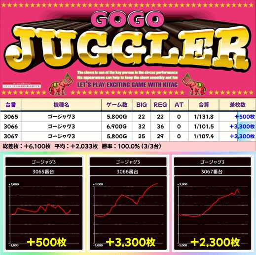 【3台並び】3065-3067番台 ゴーゴージャグラー3▶平均+2,033枚