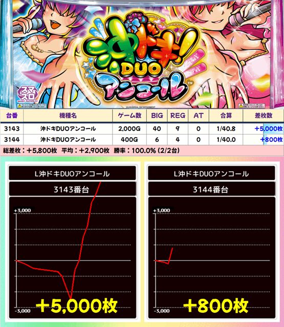 【2台並び】3143-3144番台 沖ドキDUOアンコール▶平均+2,900枚