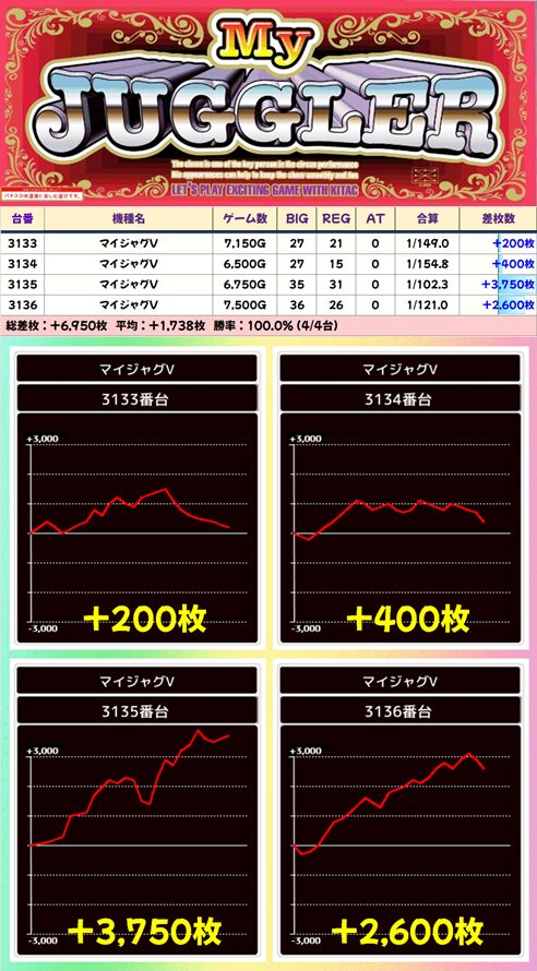 【4台並び】3133-3136番台 マイジャグラーV▶平均+1,738枚