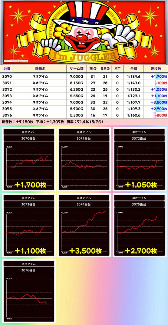 【7台並び】3070-3076番台 ネオアイムジャグラー▶平均+1,307枚