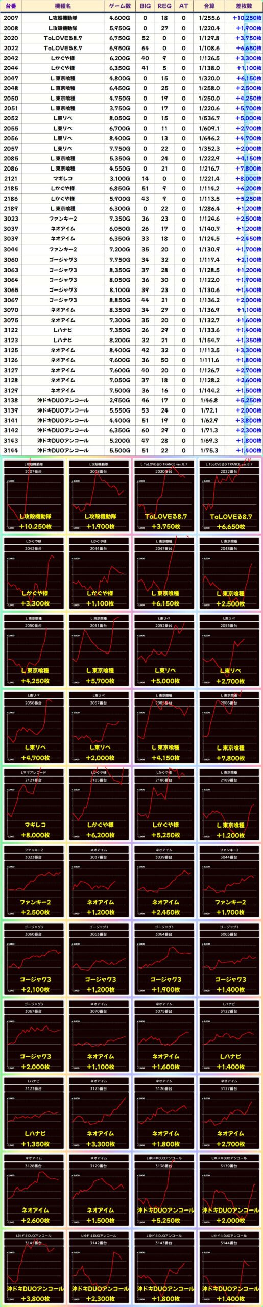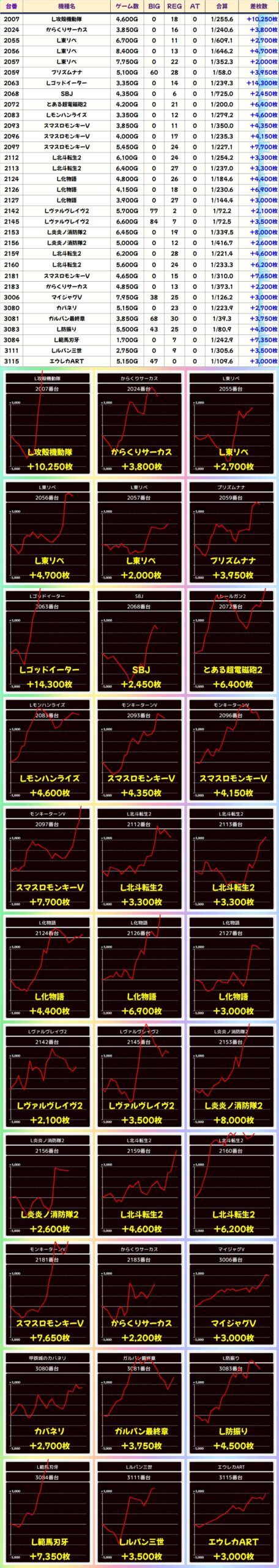 本日はメイン機種を中心に高配分機種が用意!本日はジャグ系が多数仕掛けの対処になっていまいた。また、人気スマスロの東京喰種 やマギレコ、攻殻機動隊から万枚を含めた大量獲得台が多数確認できました!