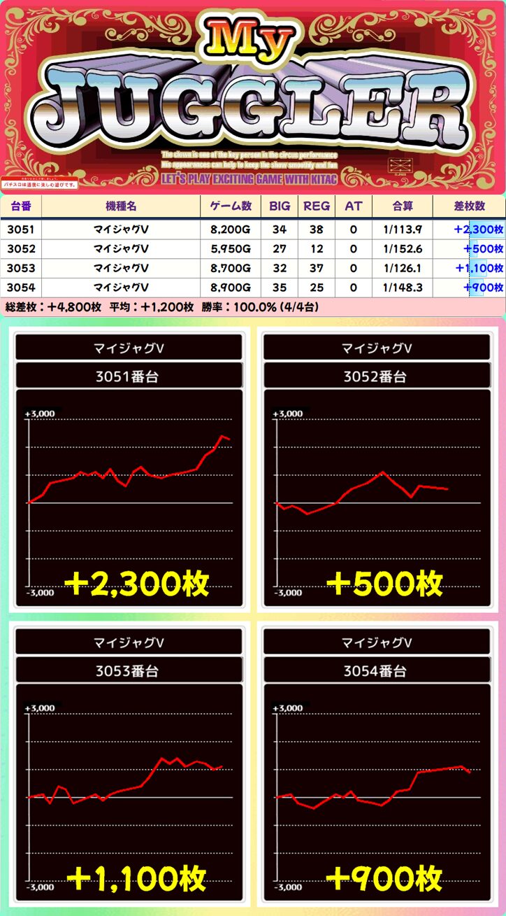 【4台並び】3051-3054番台 マイジャグラーV▶平均+1,200枚