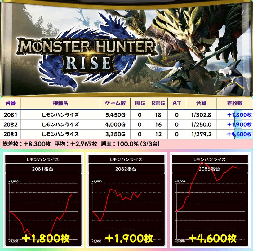 【3台並び】2081-2083番台 モンスターハンターライズ▶平均+2,767枚