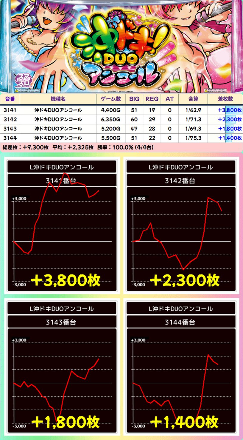沖ドキDUOアンコール (6/9台+) ➡平均 +1,239枚
