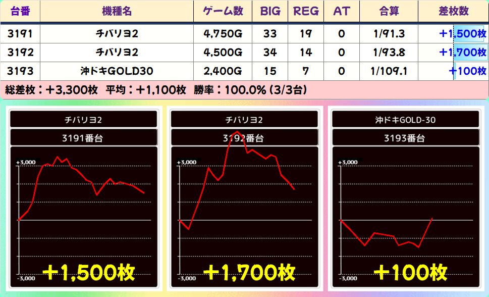 【3台並び】3191-3193番台 チバリヨ2-沖ドキ!GOLD▶平均+1,100枚