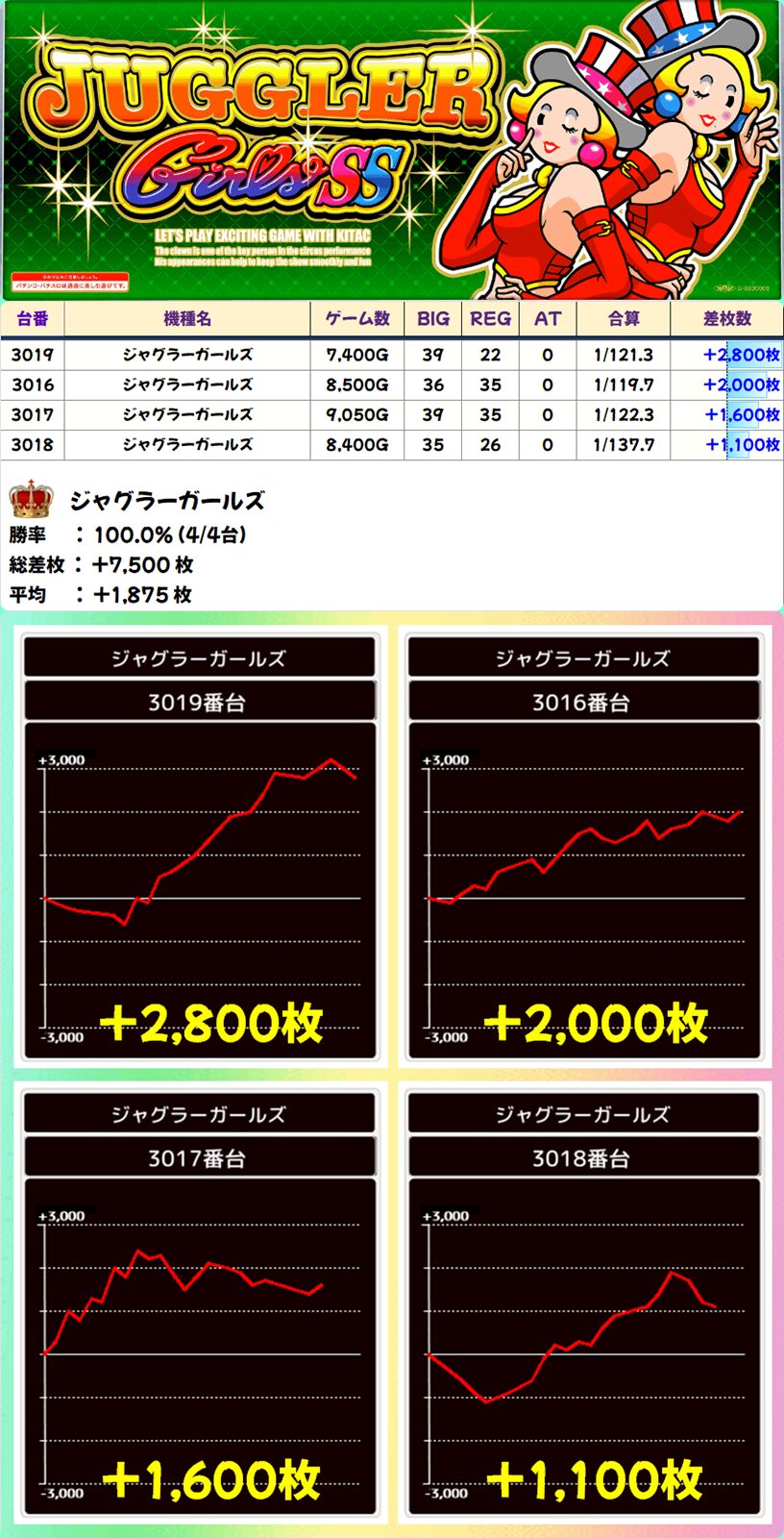 ジャグラーガールズ (4/4台+) ➡平均 +1,875枚