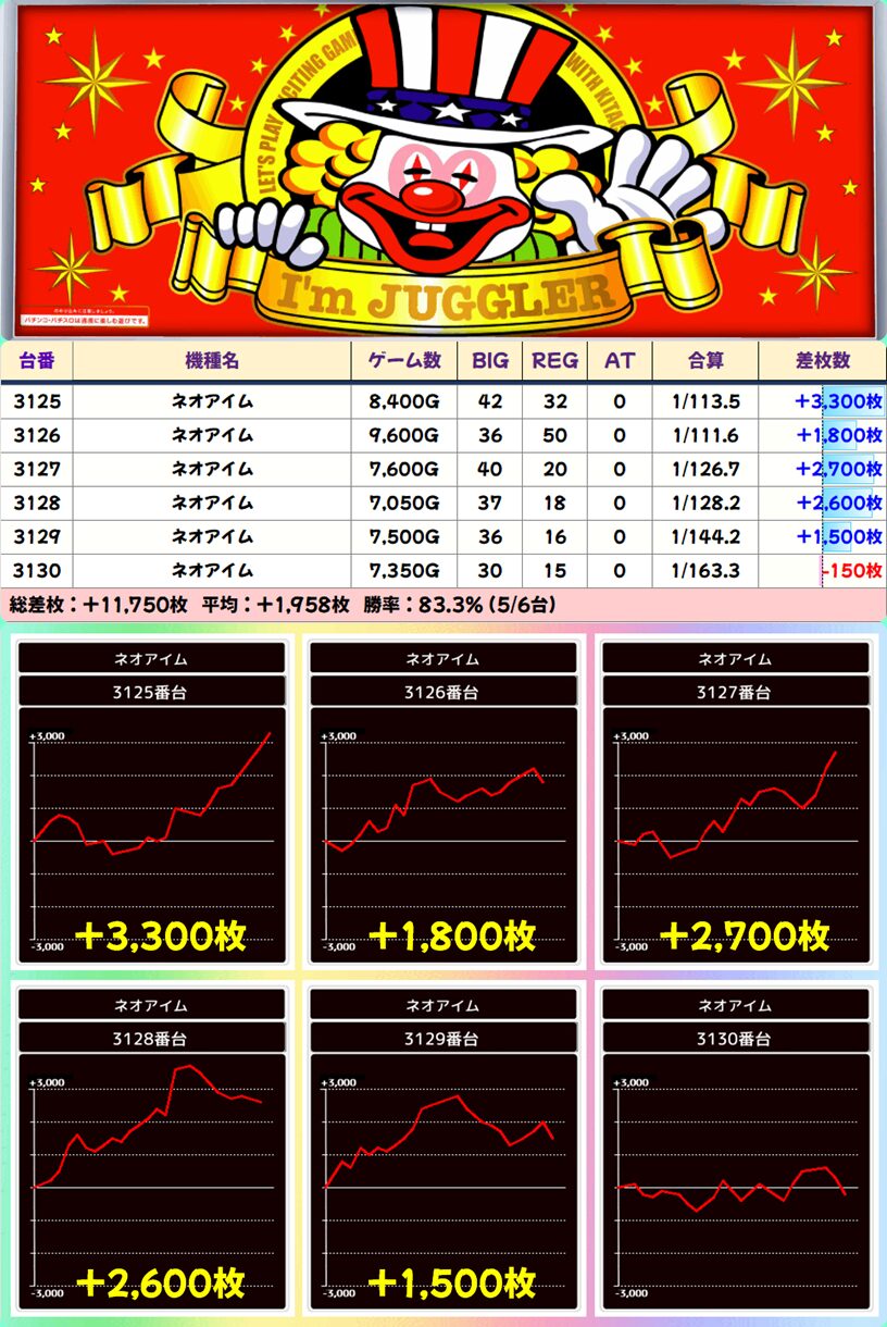 【6台並び】3125-3130番台 ネオアイムジャグラーEX▶平均+1,958枚
