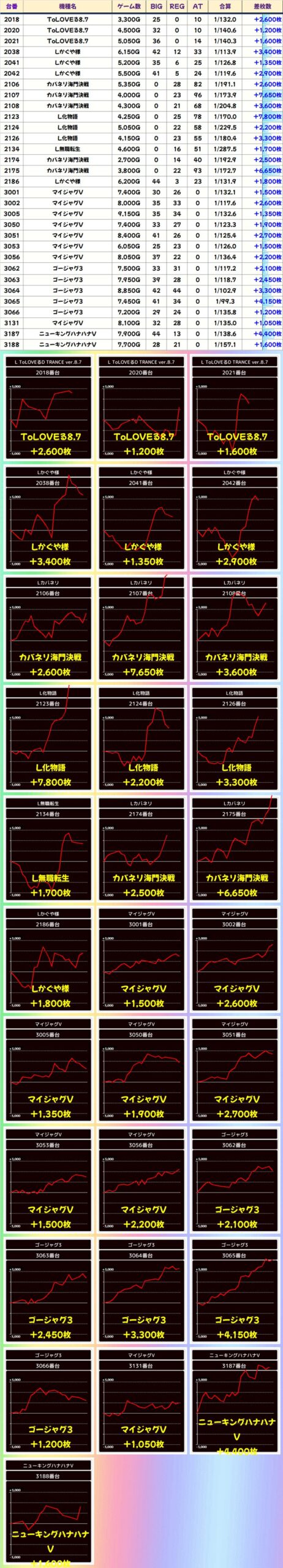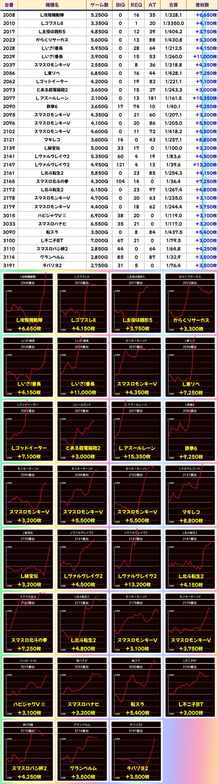 今回の全台系濃厚機種は上記の通り。バババ機種からは新鬼が選ばれました。また、8のつく日はBT機が仕掛けの対象になりやすく、今回も例にもれずシェイクが全台系濃厚に!