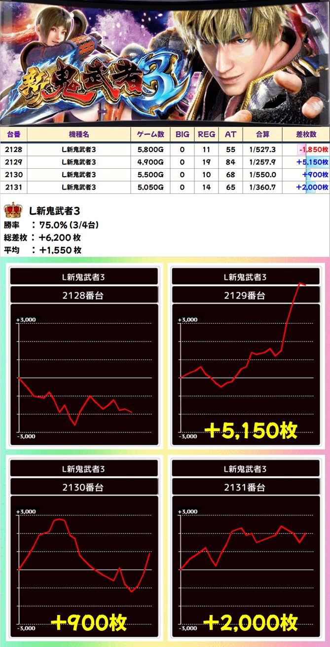 L新鬼武者3 (3/4台+) ➡平均 +1,550枚