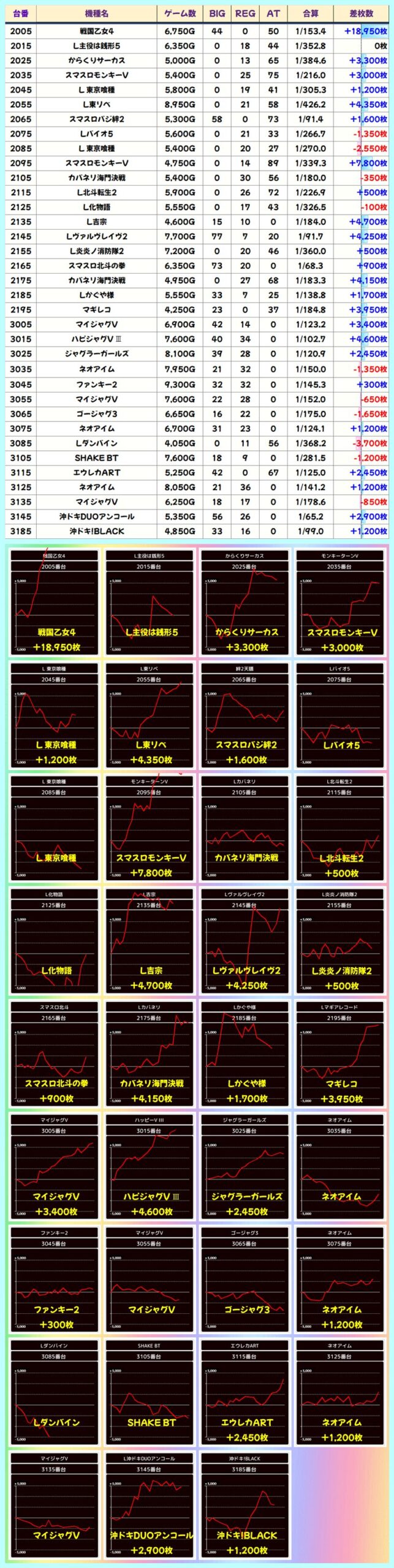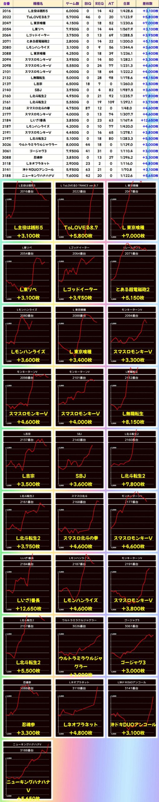 本日の全台系濃厚機種は上記の3機種!末尾だけでなく上質な全台系も用意されております。今回は小台数から中規模な設置の機種たちが全台系濃厚!いずれも勝率・差枚ともに優秀な結果を残しました。
