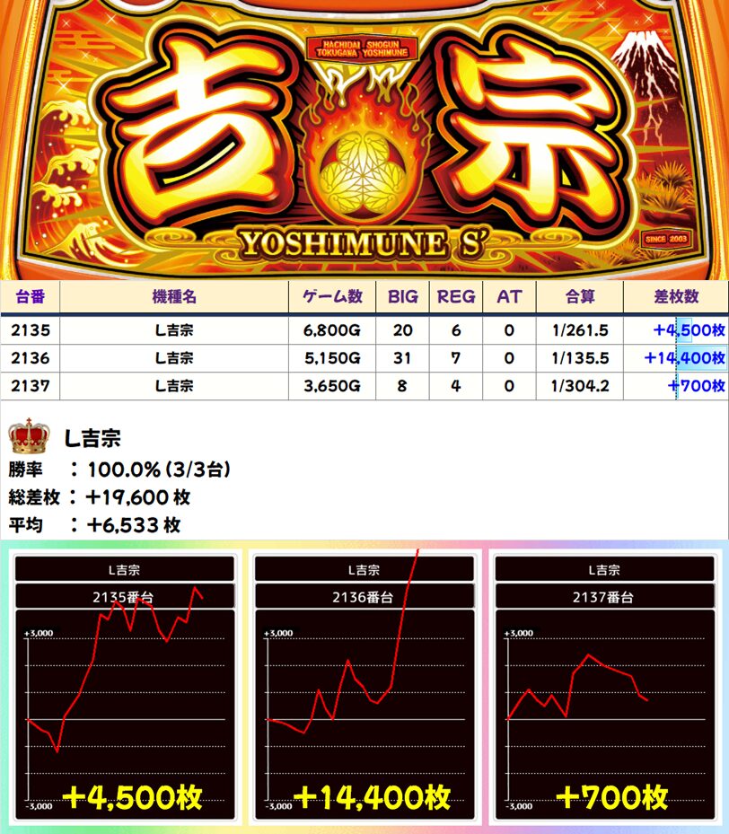 L吉宗 (3/3台+) ➡平均 +6,533枚