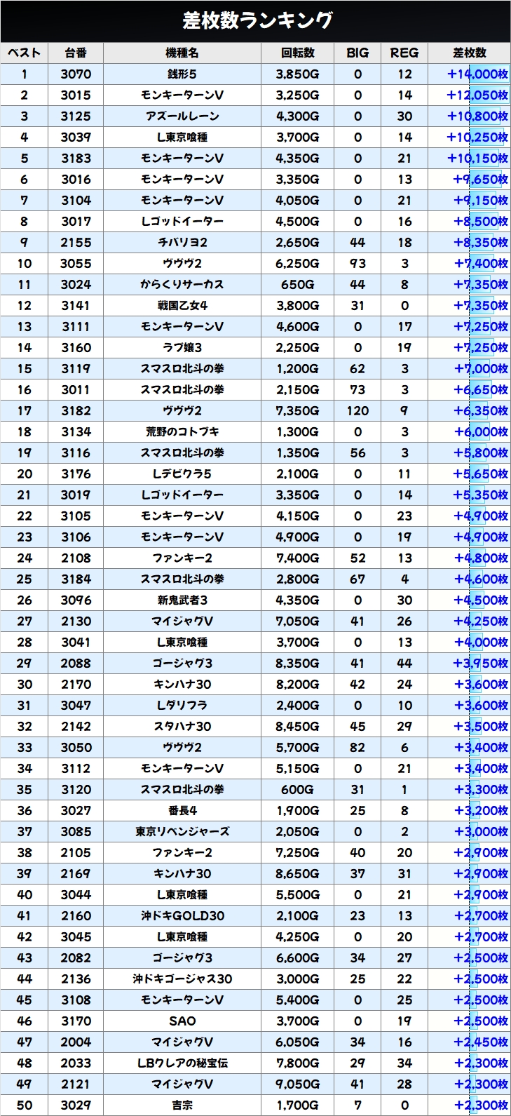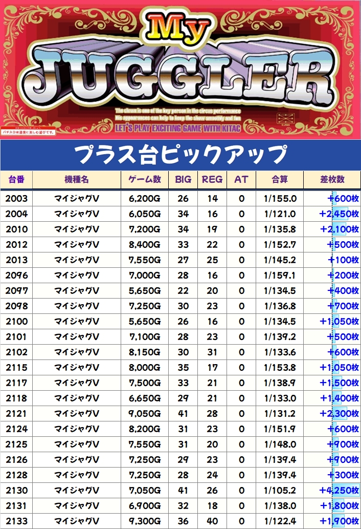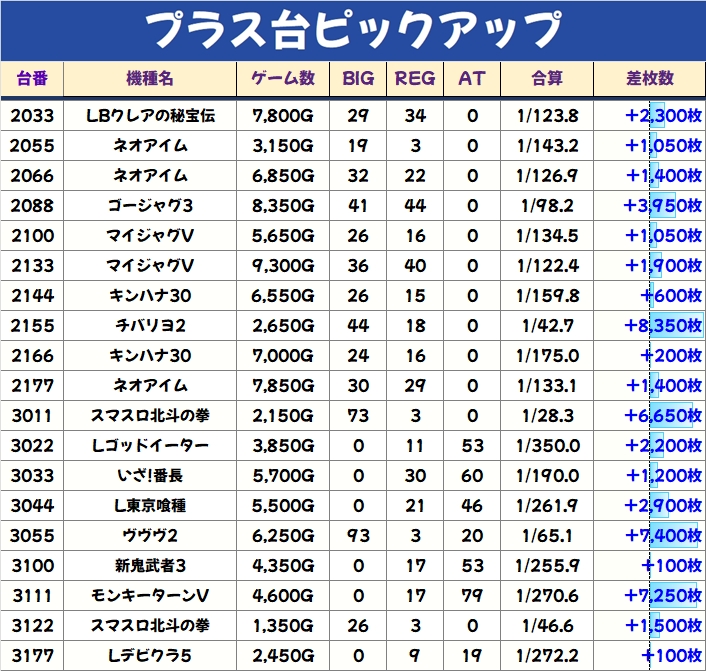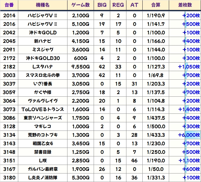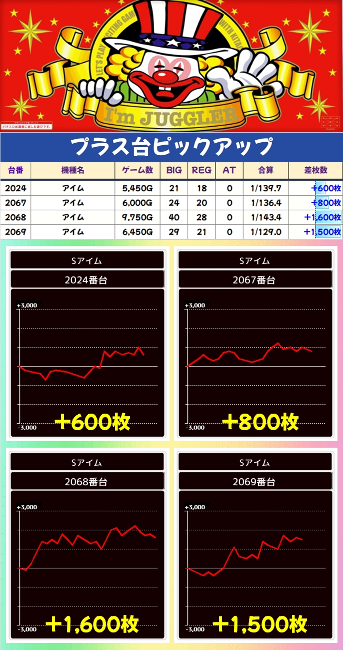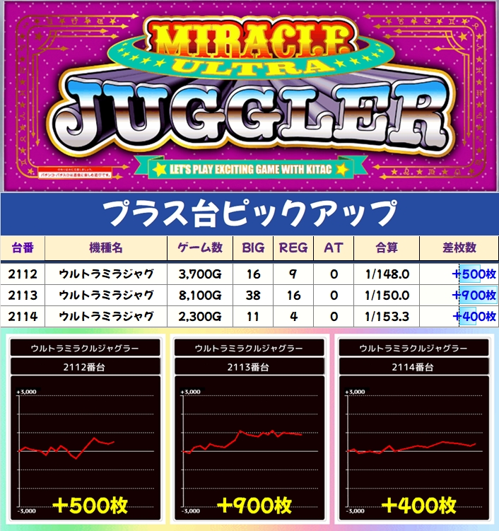 機種イチや少数台にも高設定が多数投入されており、悪番対策もバッチリだったようです。
