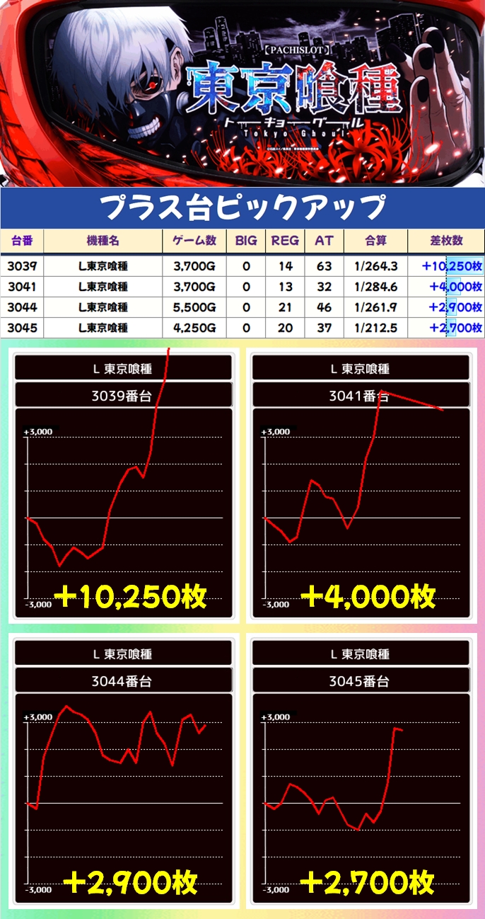 この日は全台系以外にも高配分機種が用意されており、多台数のマイジャグ、ネオアイム、東京喰種、キンハナなど高配分機種が多数出現!