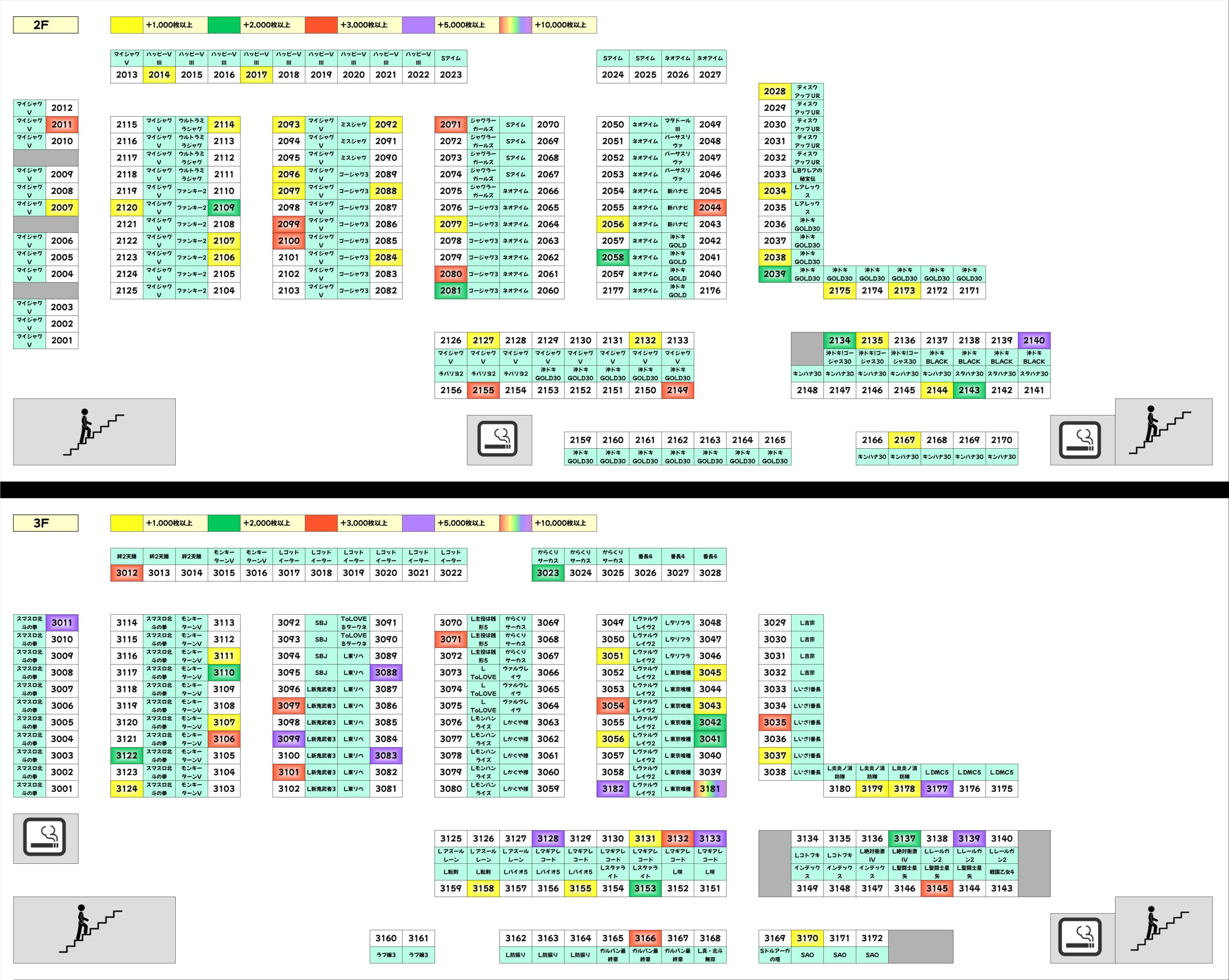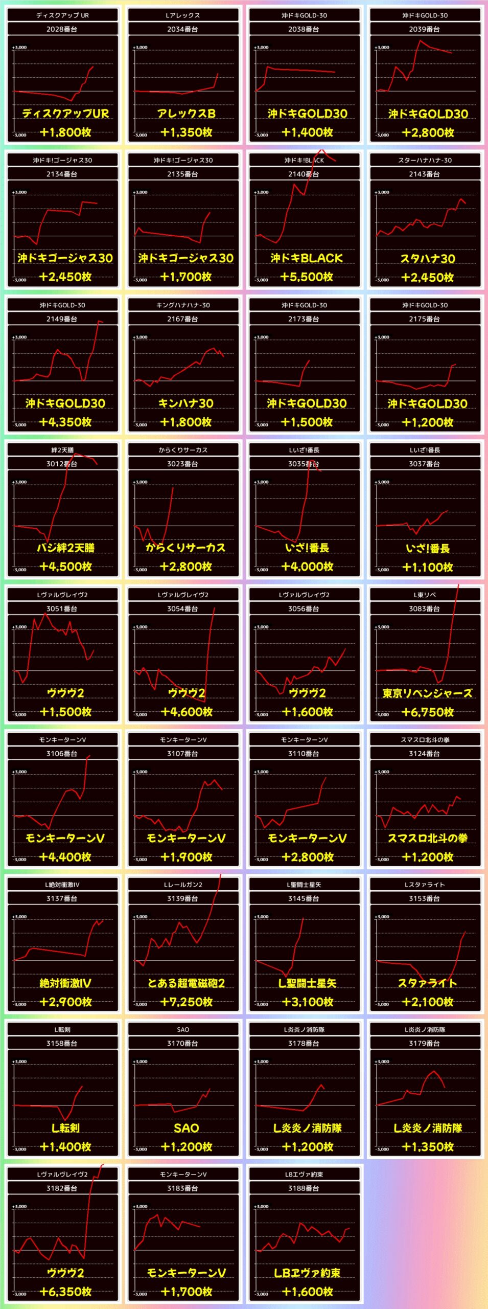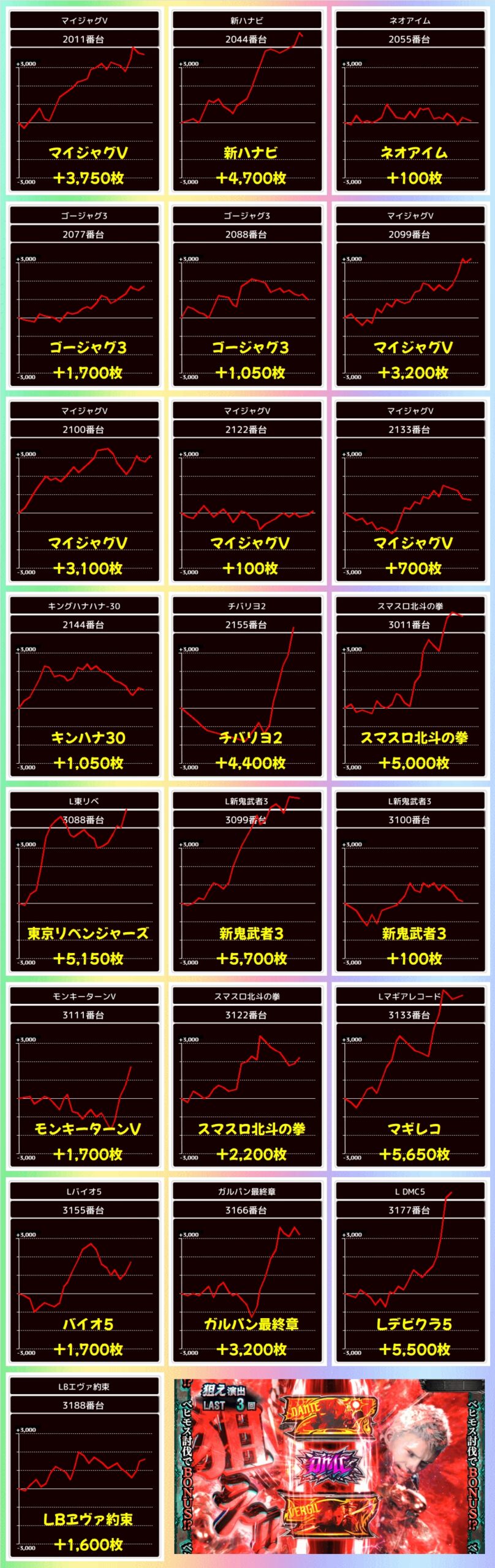 この日は仕掛け以外に単品での投入も多かったようで、フロアを問わず幅広い機種から優秀台を確認。